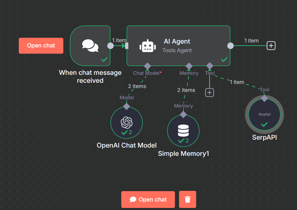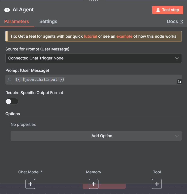 在 Chat Trigger 後面緊接著就是 AI Agent ,因為此應用就是只需要問答,然後讓 AI 上網找資料。