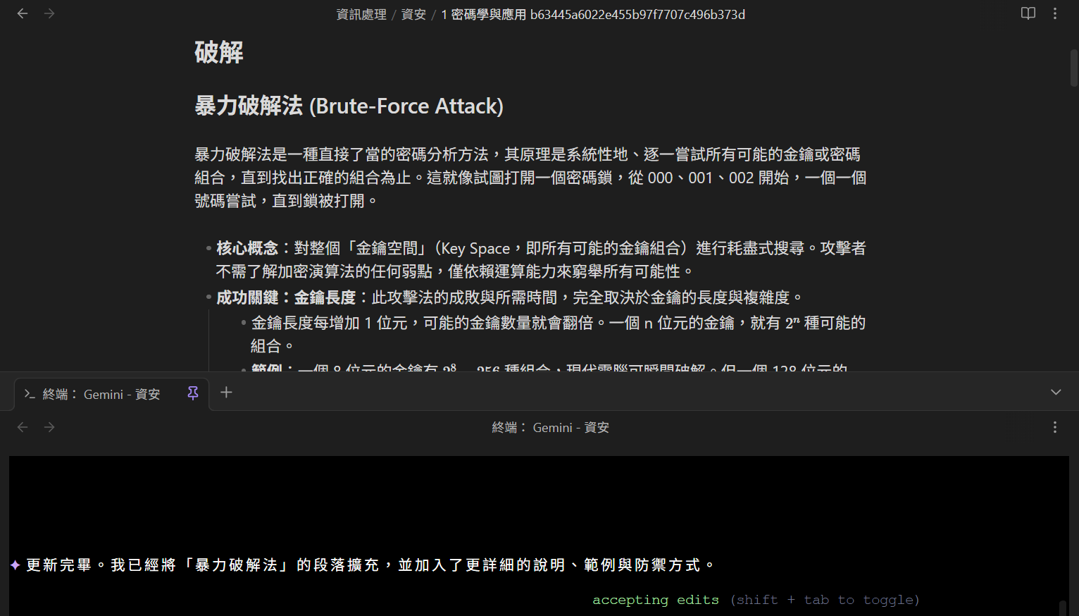 例如底下的範例圖片,這是資訊安全的講義,本來暴力破解法我其實沒有記到什麼內容,所以就讓 Gemini Cli 針對暴力破解法詳細說明內容。它會直接針對段落修改。