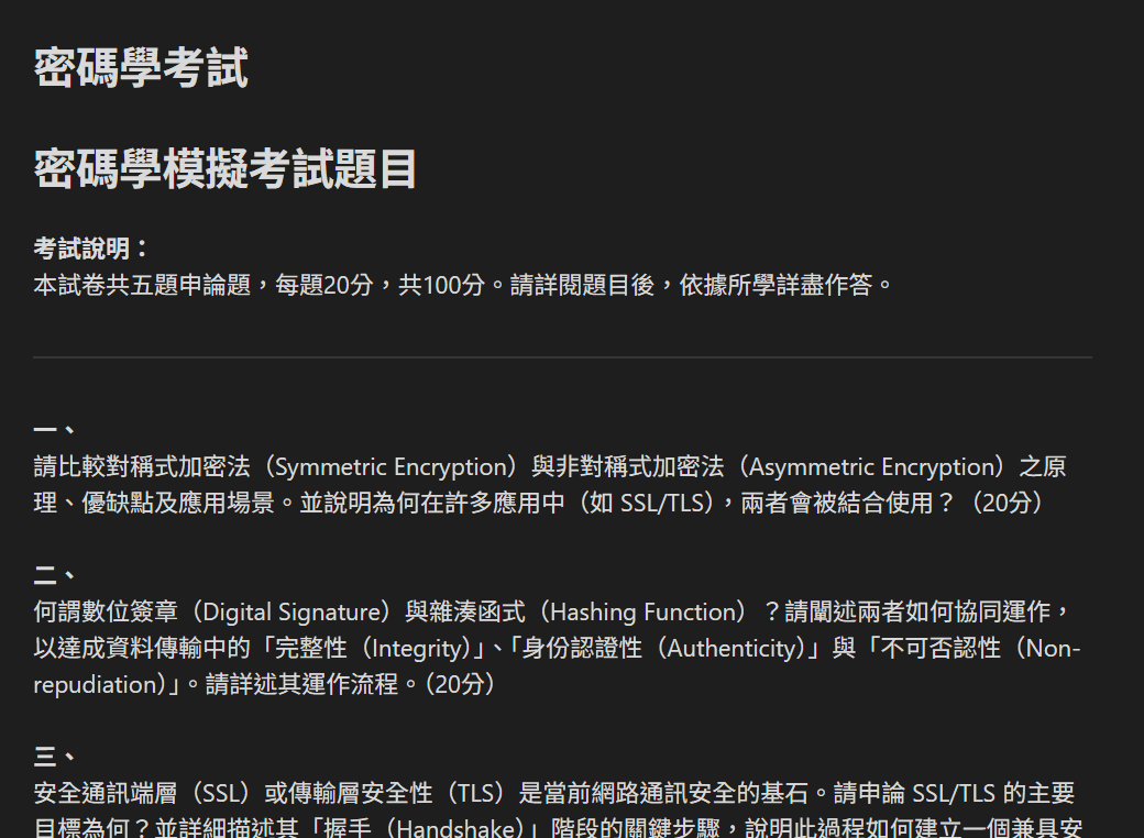 底下的範例,是針對我的密碼學筆記,要求 Gemini Cli 模擬高考考題,出 5 個題目,然後它也要把相對應的答案也寫上去。