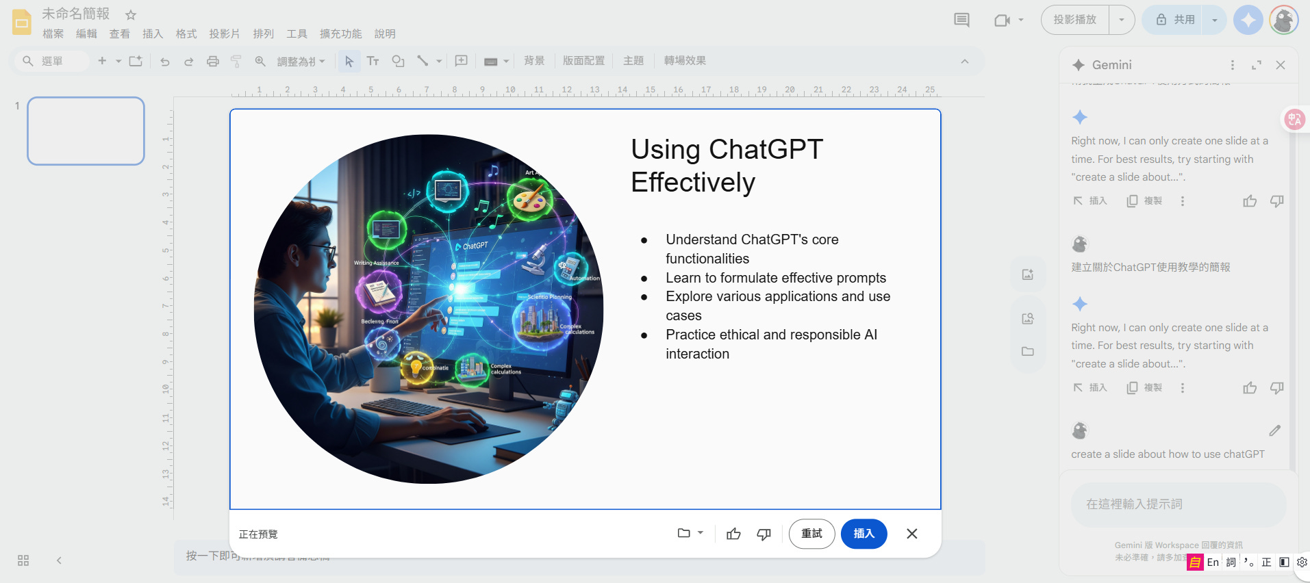 什麼意思?就是你在寫 Gmail 的時候,AI 就在旁邊幫你;你在做簡報的時候,AI 可以直接幫你生成內容;你在開 Meet 會議的時候,AI 可以幫你做會議紀錄。