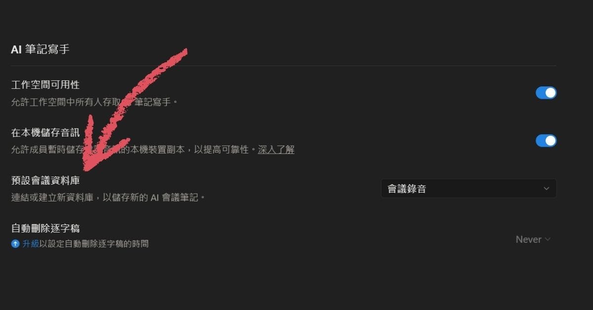 你可以先在設定→ Notion AI → AI 筆記寫手,先設定預設會議資料庫,之後固定把轉錄資料放在那裡。