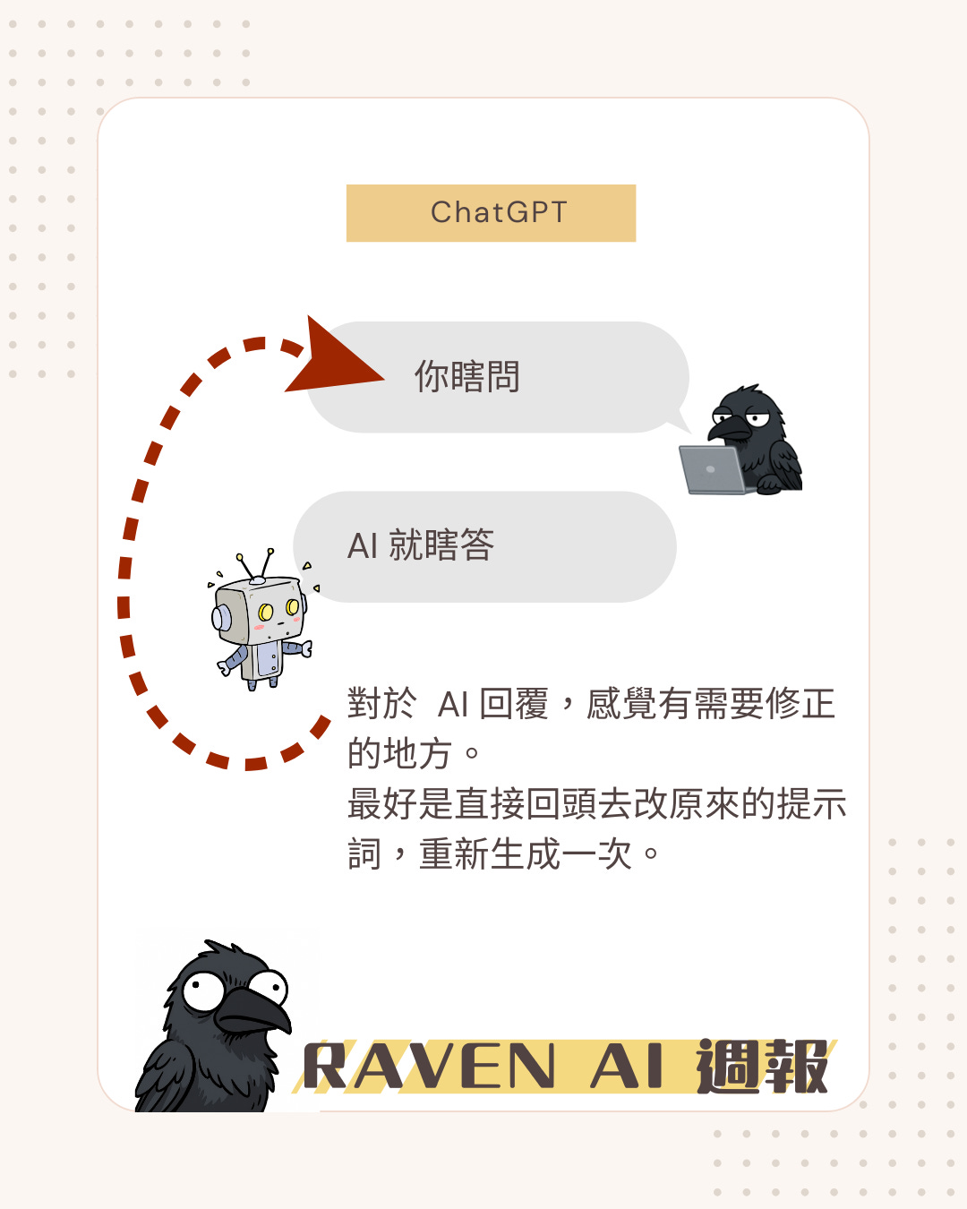 A3:用「迭代」就行。先拿到初稿,檢查哪裡誤會了,改寫題目和限制,再重生一次。重複幾輪,答案會越來越接近你要的樣子。
