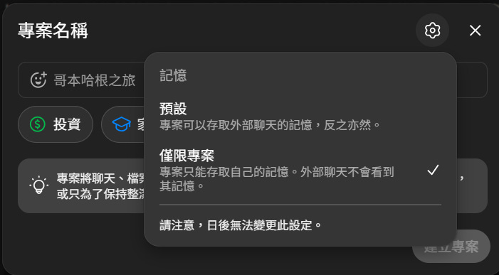如果該專案需要與其他人共同協作的話,在設計專案時,記得點擊齒輪 → 僅限專案,讓專案內的使用者,只能存取該專案內的記憶。