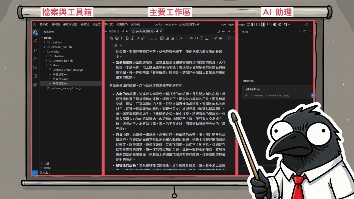 Antigravity 主要分為左、中、右三個區塊,它們分別扮演不同的角色: