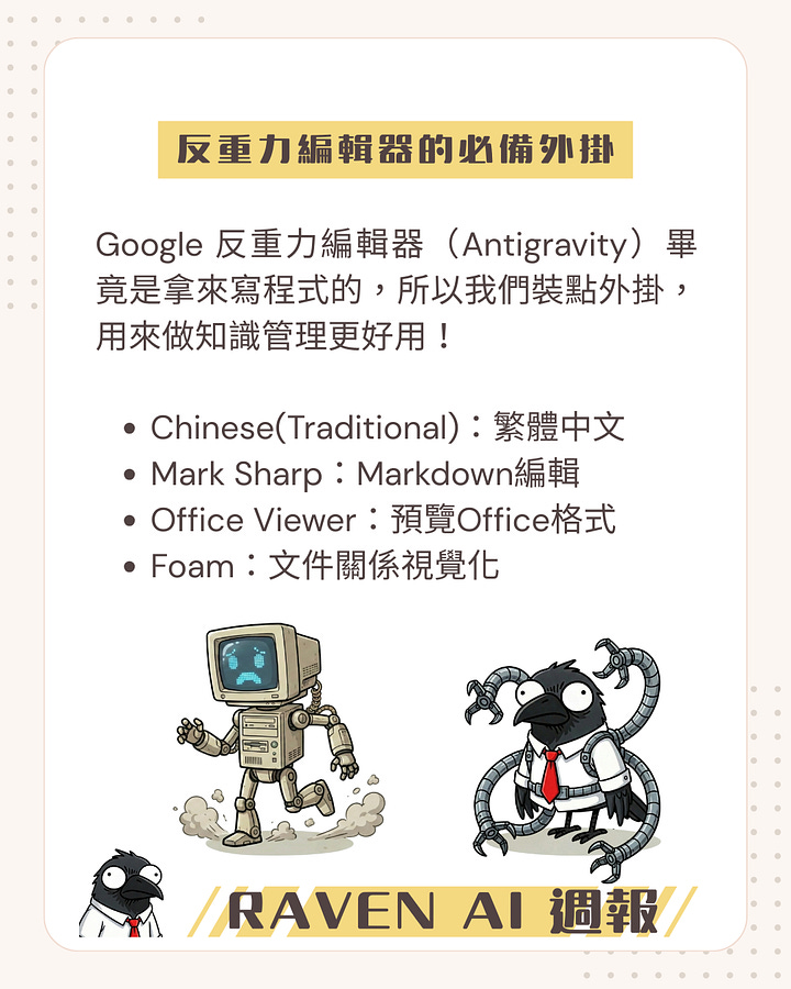 Google 反重力編輯器本質上是軟體開發工具,然而我們只需要安裝幾個外掛,它就能變成知識管理神器: