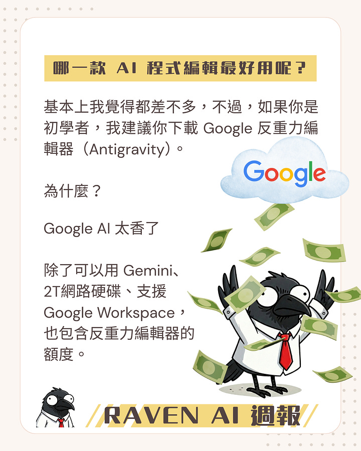 上班族其實不必追逐AI模型排行榜,真正關鍵在生態系與使用體驗。我將以 Google AI Pro 為例,說明 Gemini 與 Google Workspace 的深度整合、2TB 雲端與共享等優勢,讓月費更有 CP 值。最後推薦 Antigravity 作為知識管理與文件整理利器,並提供可套用的工作流程範例。